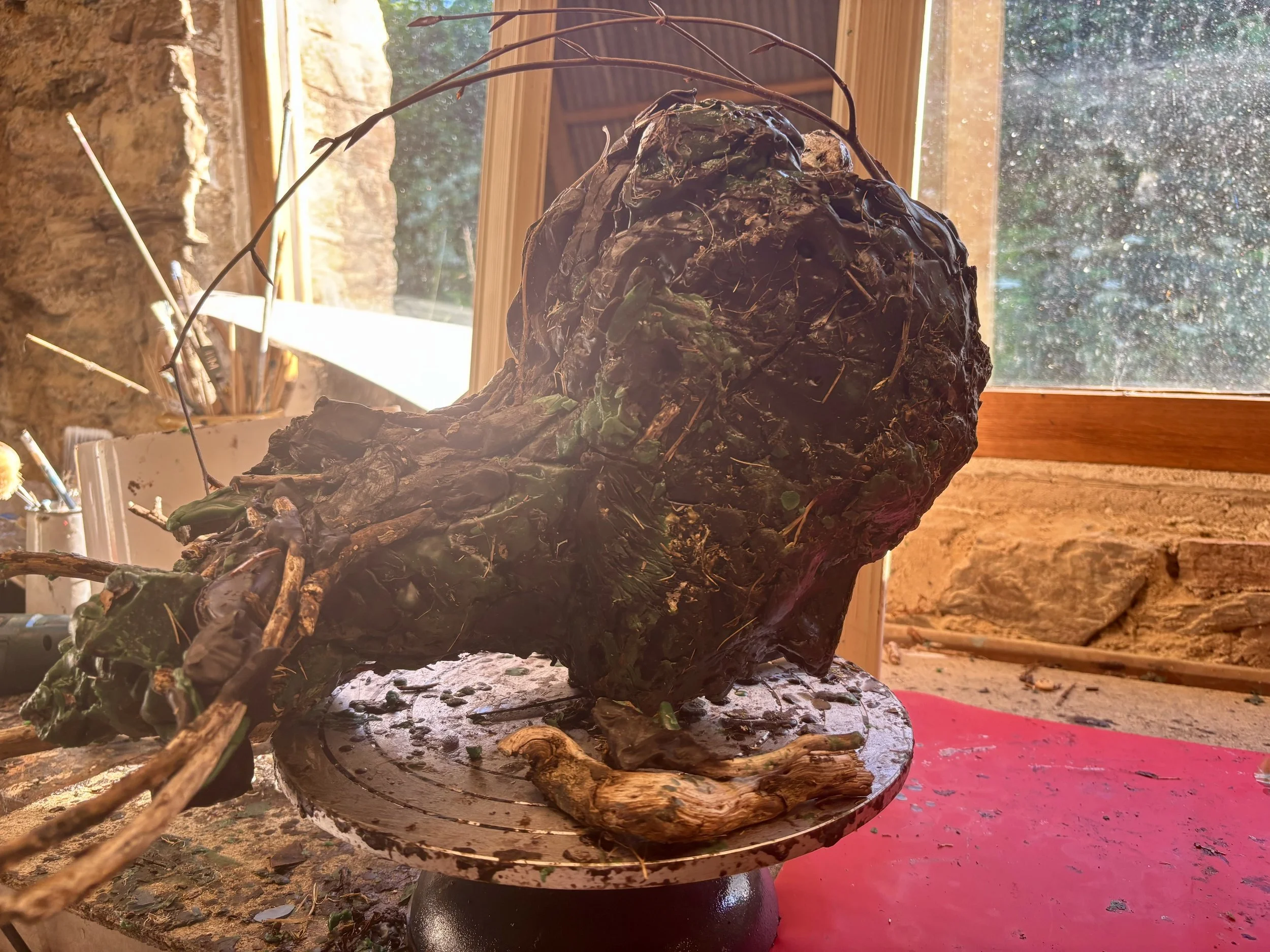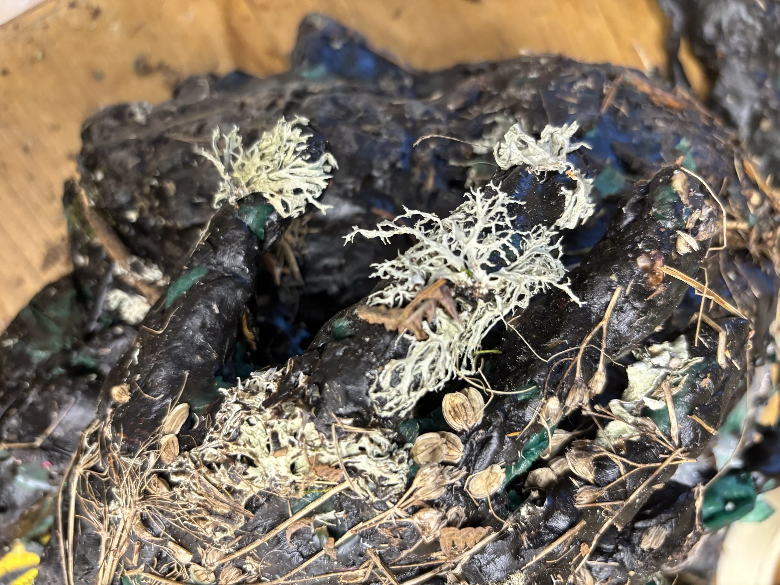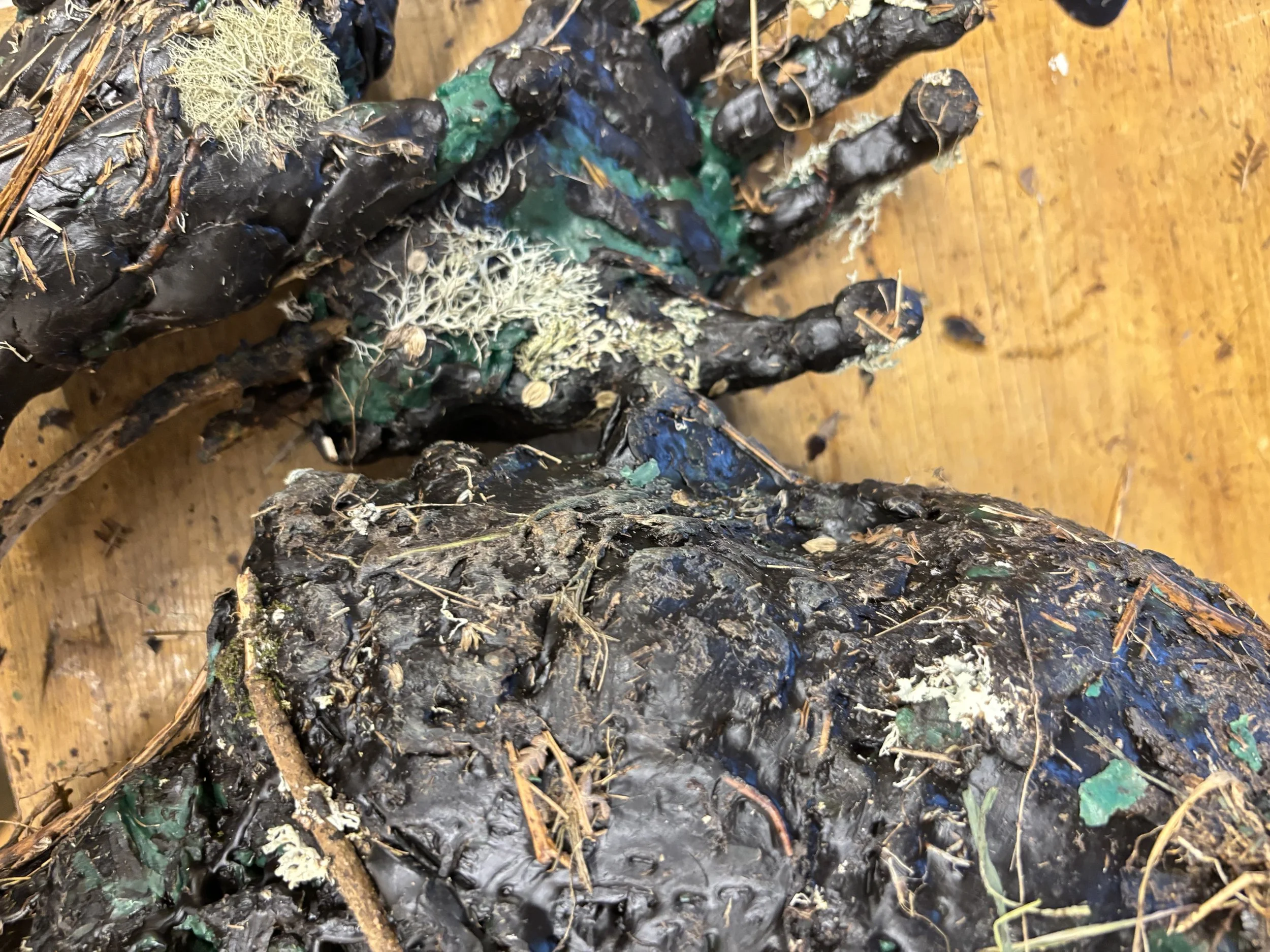 When I move through the landscape, I observe the trickling steam as it cuts through the wetlands and the granite tors above. I gather many resources from Dartmoor ( dried moss, charcoal heather sticks and dried ferns,) The resources I then use as mark making tools and to create the 2D drawings and 3D forms . .